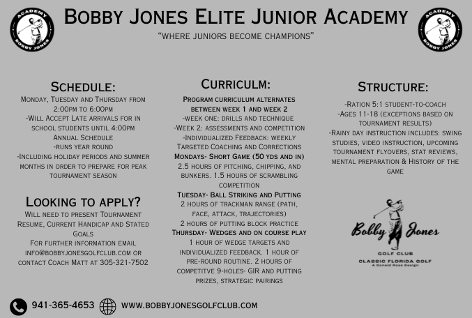 Looking to apply? Email info@bobbyjonesgolfclub.com or contact Coach Matt at 305-321-7502 with your tournament resumé, current handicap, and stated goals.